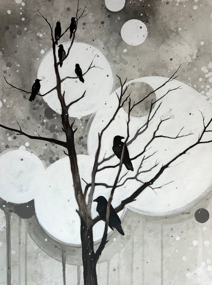 This is an original 18” x 24 acrylic on canvas painting of a tree with a meeting of 5 crows and 2 ravens. This piece has some very subtle sparkly chrome elements that really give it some depth in person!