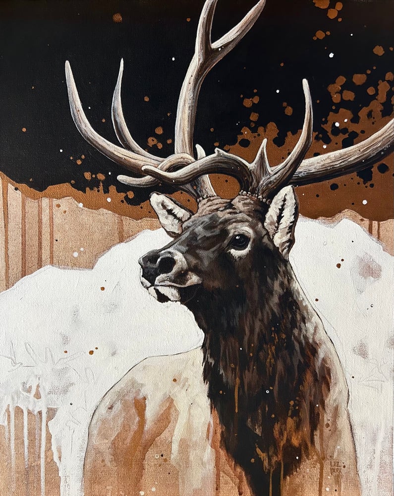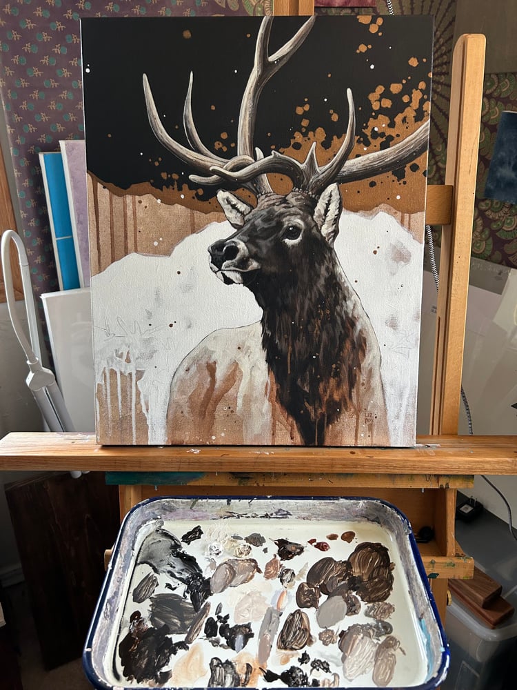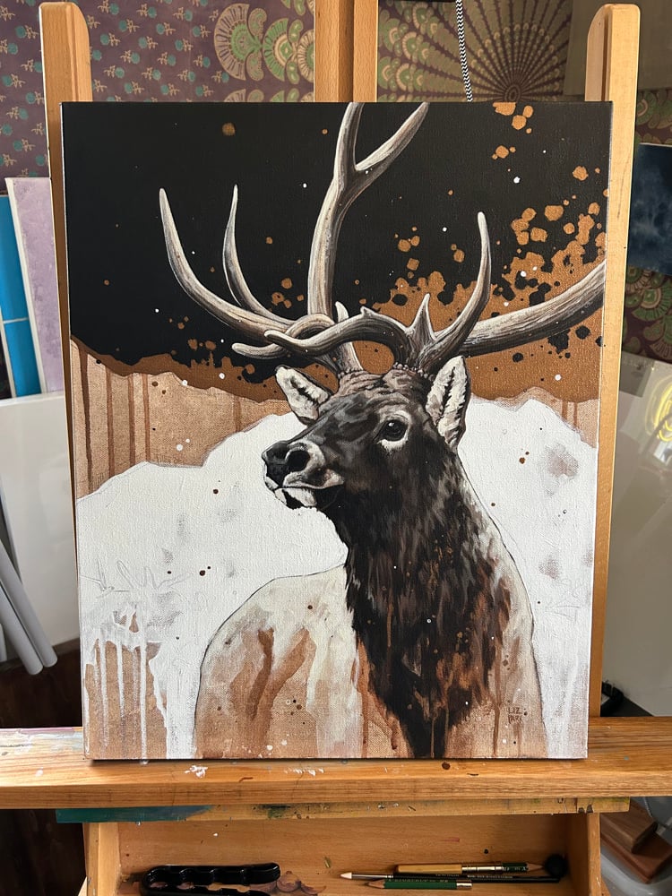 This is an original acrylic on canvas painting of a majestic AF bull elk with lots of shiny bronze details.