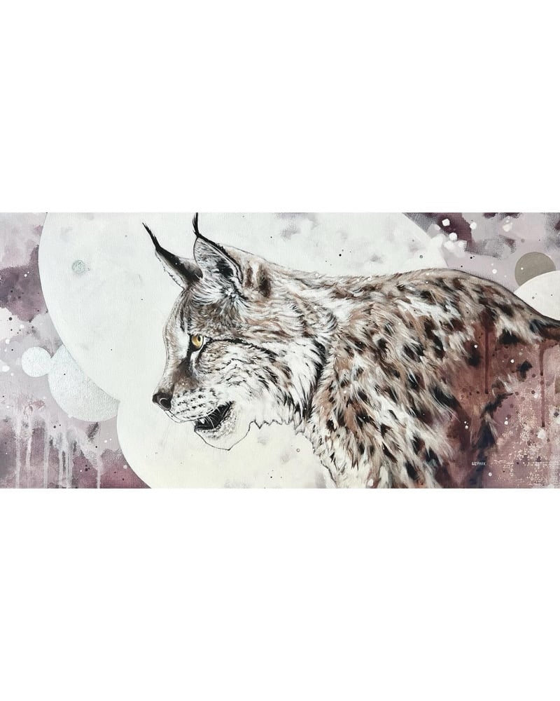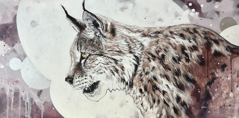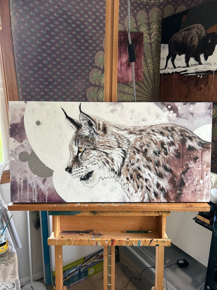 This is an original acrylic on canvas painting of a lynx with an abstracted background.