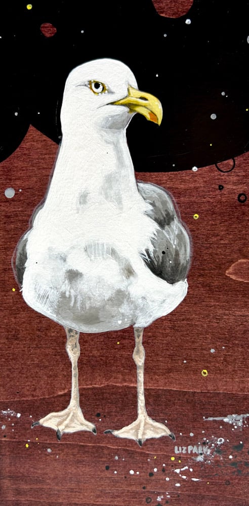 This is an original acrylic painting of a salty seagull friend on a cherry stained panel. The image continues around the edges of the panel!