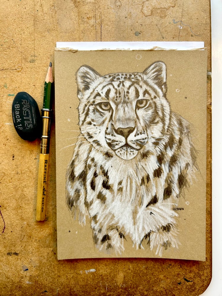 This is an original drawing of a snow leopard in pencil & colored pencil on Legion heavyweight Kraft brown paper.