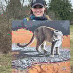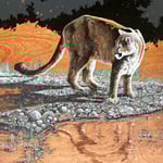 This is an original acrylic painting on a stained wood panel of a mountain lion at the rivers edge.